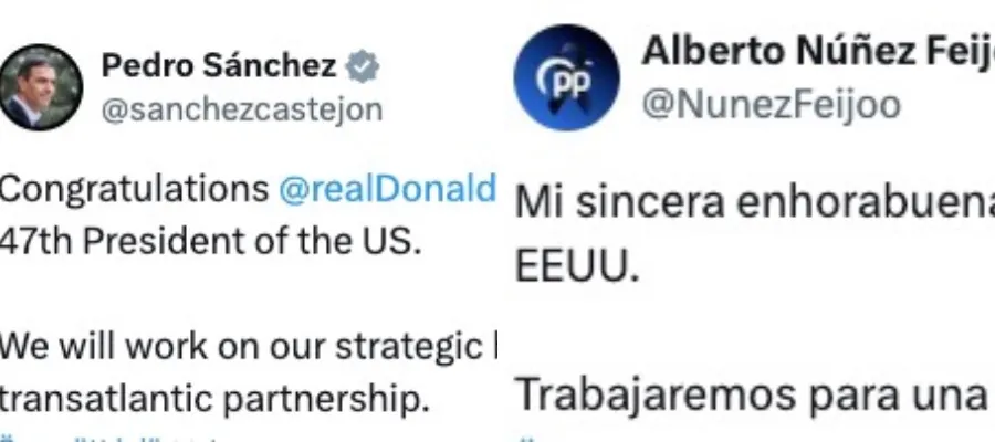 ”Vi kommer att arbeta med våra strategiska bilaterala förbindelser och ett starkt transatlantiskt partnerskap” skriver Pedro Sánchez på X medan Núñez Feijóo sänder sina ”uppriktiga gratulationer” till den republikanska kandidaten.