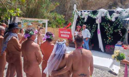 Det var avklätt och billig (!) bröllopsklädsel som gällde när inte mindre än åtta nudistpar gifte sig i helgen på Cantarriján-stranden i Almuñécar på Costa Tropical. Det var första gången sedan 1934 som ett sådant storbröllop hölls. Det var föreningen Asociación de Amigos de la Playa Nudista de Cantarriján med stöd av turistmyndigheten Patronato de Turismo de Almuñécar- La Herradura som ansvarade för evenemanget, skriver kommunen i ett pressmeddelande.