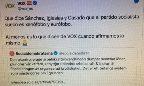 ”Vad säger Sánchez, Iglesias och Casado? Är det svenska socialistpartiet främlingsfientligt och eurofobiskt. Det är åtminstone vad de säger om Vox när vi säger samma sak”.